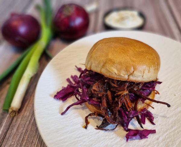 Pulled Beef schmeckt hervorragend als Burger mit Rotkohl- oder Krautsalat und einem Dip aus Crème fraîche mit Tango Argentino.